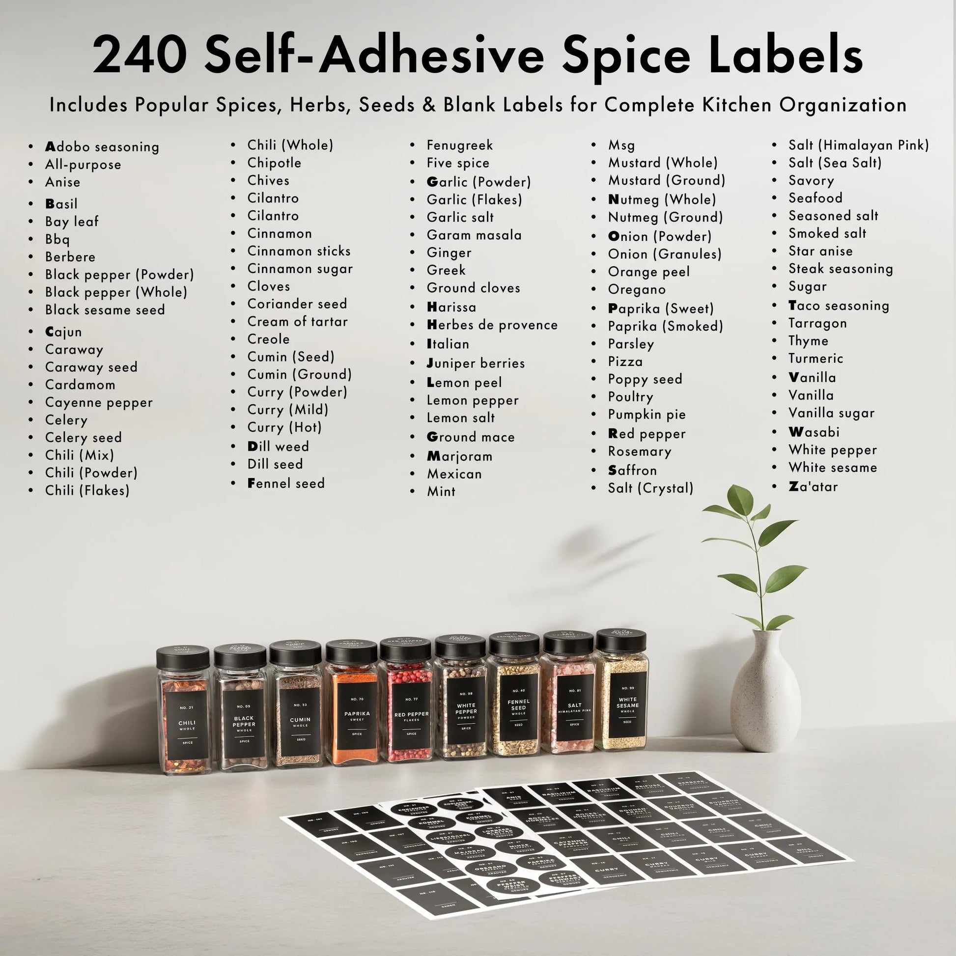 - 240 durable labels with a clean, dark design make quick identification easy, so you can grab the right spice in seconds, and they resist smudging.