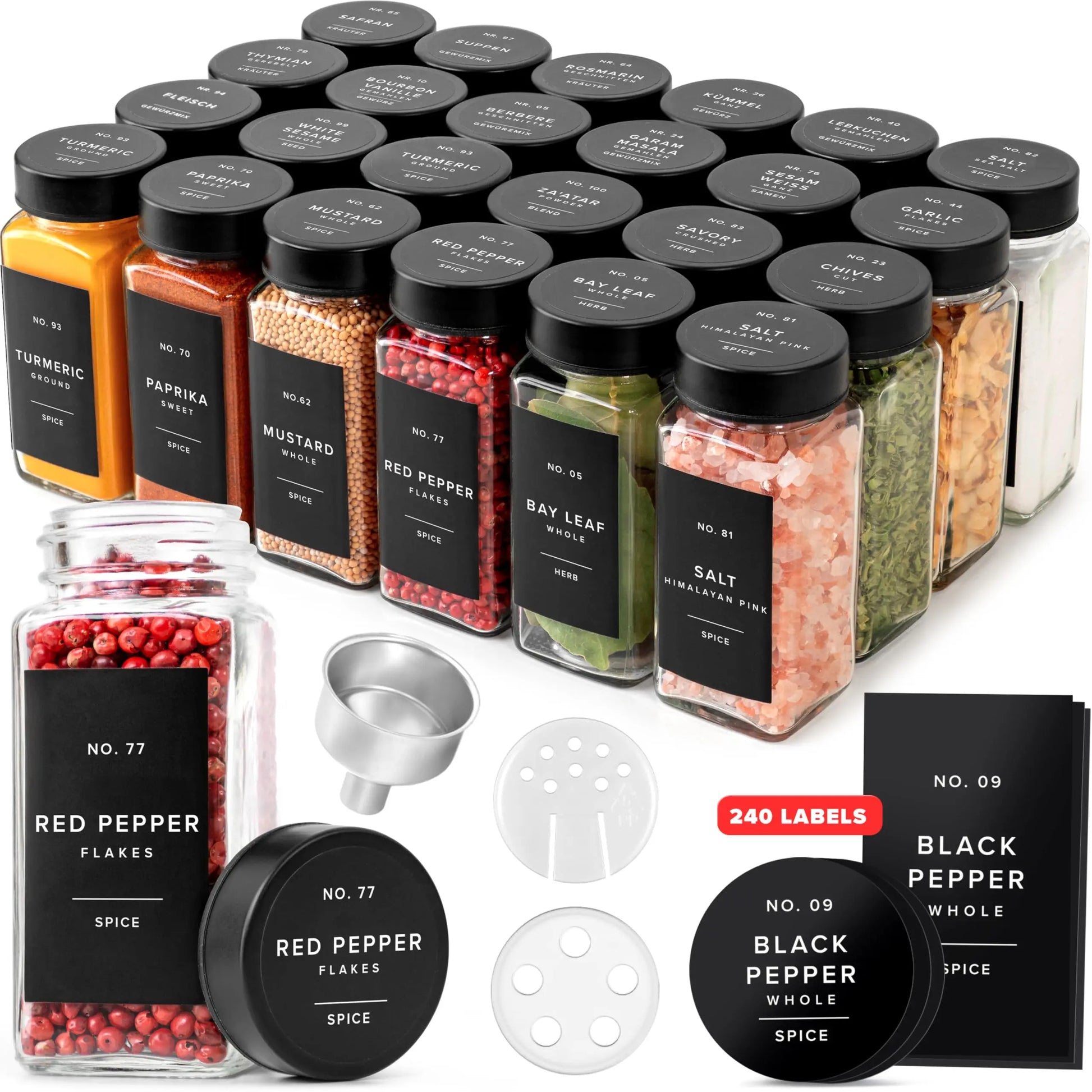 - Square glass jars with airtight stainless steel lids (24 jars) and matching shakers/dispensers keep flavors fresh and visible as you measure, shake, and pour.