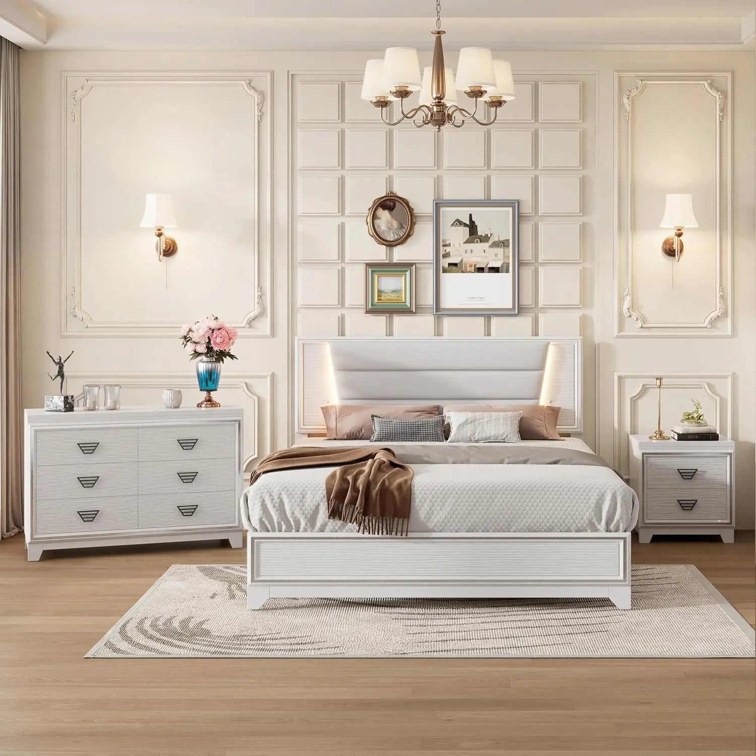 - Queen-size platform bed with integrated LED lighting creates a warm, welcoming mood with soft illumination, optional dimming, and space-saving design.