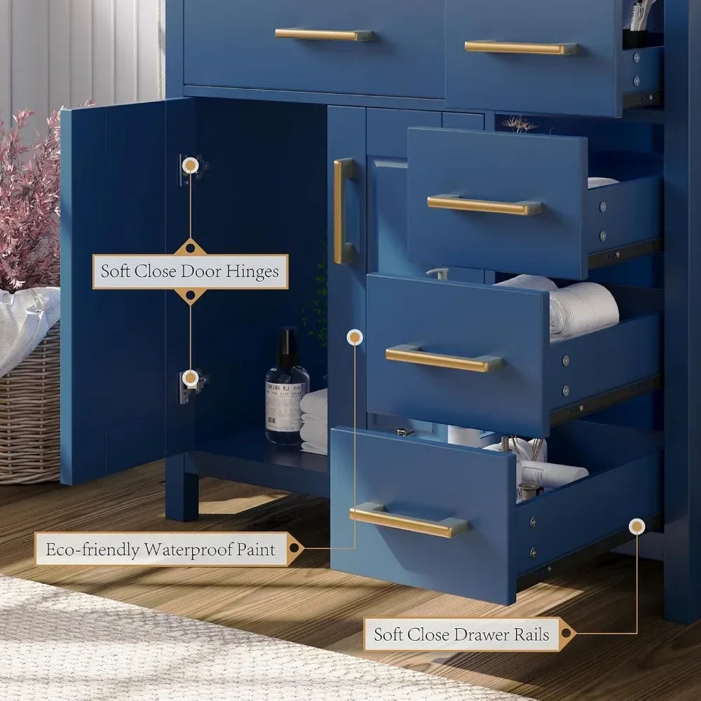 - You gain huge storage: Two doors and four soft-close drawers keep towels, toiletries, and cosmetics neatly organized within reach, while soft-close reduces noise.