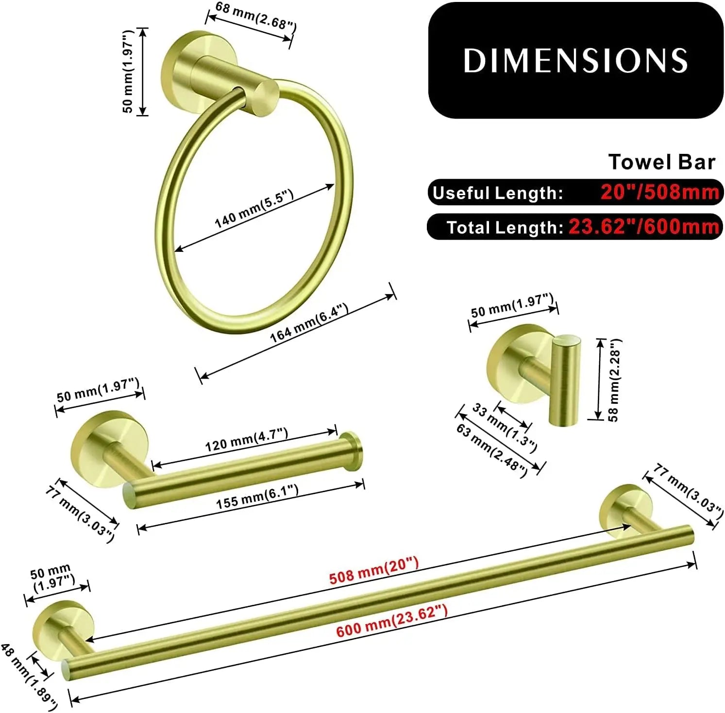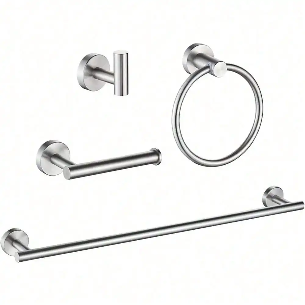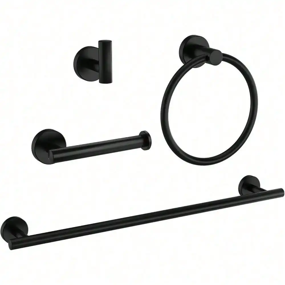 【Bathroom Towel Holder Set】 This convenient bath hardware set combines 4 essential bathroom accessories: a 24in towel bar, toilet paper holder, towel ring, and robe hook, allowing you to upgrade your bathroom with ease. 【Well Organized】 Towel rack for bathroom keeps your shower room organized and tidy, ensuring towels, bathrobes, and tissue rolls are easily accessible and properly stored. 【Premium Material】 Made of high-quality 304 stainless steel, it ensures strong resistance to scratches, corrosion, rust, and tarnish, making it built to last. 【Sleek Design】 Elevate your bathroom with our modern & stunning towel rack set. 【Easy to Install】 Comes with all the accessories and instructions required for installation, making installation quick and easy.