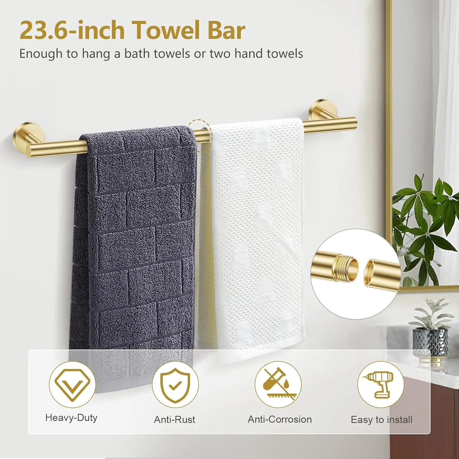 【Premium Quality Construction】This bathroom hardware set is crafted from high-grade stainless steel, ensuring exceptional durability and resistance to rust, corrosion, and scratches. The material is easy to clean, helping maintain a pristine bathroom environment for years of reliable use. 【Complete 5-Piece Set】The set includes: 1 towel bar (23.6 inches), 1 towel ring, 1 toilet paper holder with an integrated shelf, and 2 coat hooks. All necessary screw hardware and clear installation instructions are provided for straightforward wall mounting. 【Thoughtful Design Features】The toilet paper holder features a subtle slope on top to prevent items like phones or small decor from slipping off. Every edge is meticulously polished for safety and aesthetics, while the rod ends have knobs to securely hold toilet paper rolls in place. 【Versatile Functionality】Use the towel bar not just for towels but also for hanging clothes; the hooks are perfect for organizing shower accessories, keys, kitchen tools, or other essentials. This versatile set suits various spaces including bathrooms, kitchens, bedrooms, laundry rooms, and gyms. 【Easy Installation & Maintenance】Designed for simple DIY installation with included hardware. The brushed gold finish adds a modern touch that complements most decors without requiring frequent upkeep. 【Customer Satisfaction Guarantee】We stand behind our products with dedicated support. If you encounter any issues with your bathroom hardware kit, contact us promptly—we're committed to resolving concerns quickly to ensure your complete satisfaction.